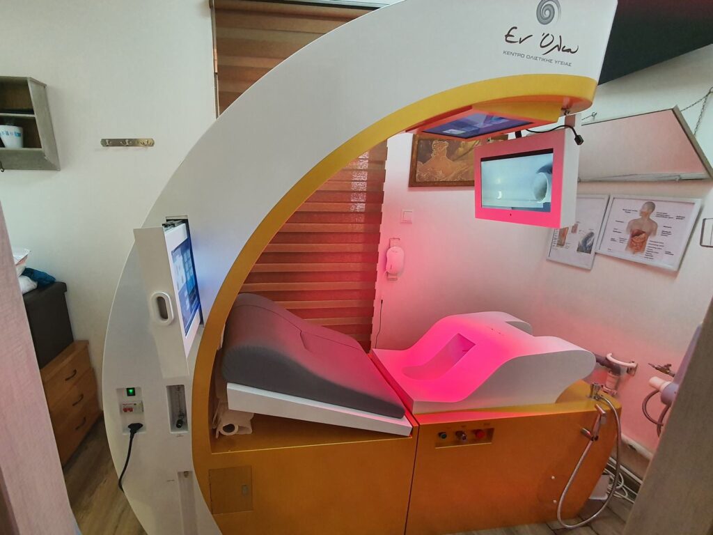 Το μηχάνημα υδροκαθαρισμού που διαθέτει το κέντρο Eν Όλω είναι μοναδικό στην Ελλάδα. Είναι ανοικτού κυκλώματος και επιτρέπει στον θεραπευόμενο, να συνδέσει το ακροφύσιο μόνος του, χωρίς τη μέχρι πρότινος απαραίτητη παρουσία του γιατρού, εφ’ όσον το επιθυμεί. Επίσης διαθέτει λειτουργία υπερύθρων (infrared therapy).